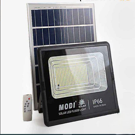 پروژکتور خورشیدی SMD دائم کار 100 وات مودی پروژکتور خورشیدی SMD 100 وات مودی یکی از پروژکتورهای خورشیدی مودی است که از طریق نور آفتاب و بدون نیاز به برق شهری مورد استفاده قرار میگیرد. با توجه به درجه حفاظتی بالای این محصول (IP66) مقاومت بالایی در برابر شرایط مختلف آبوهوایی دارد. نورافکن سولار 100 وات مودی مجهز به فتوسل، تایمر و دارای ریموت است.پنل خورشیدی نیز به ارتفاع 35 و عرض آن 23/5 سانتیمتر است. پنل سولار یک پایه جهت نصب دارد. این پنل بایستی در برابر تابش مستقیم نور آفتاب نصب شود. بدنه پنل از جنس آلومینیوم است که مقاومت بالایی در برابر رطوبت و باران دارد. همچنین یک سیم رابط به طول 2 متر جهت اتصال به پروژکتور خورشیدی SMD دائم کار 100 وات دارد.